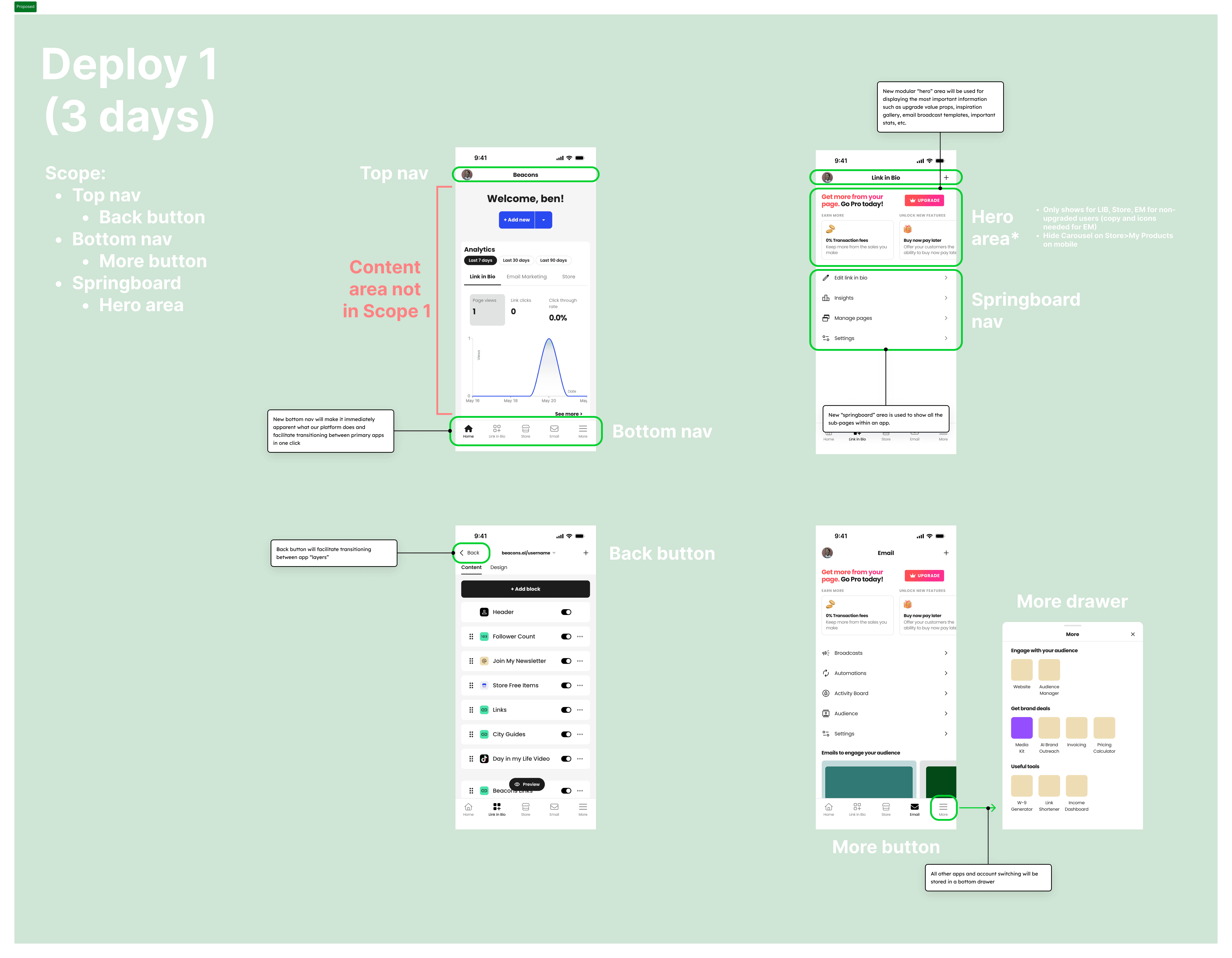 Created wireframes to illustrate springboard-style navigation, where bottom nav items led to clean landing pages that linked out to subpages (instead of cramming everything into one screen).