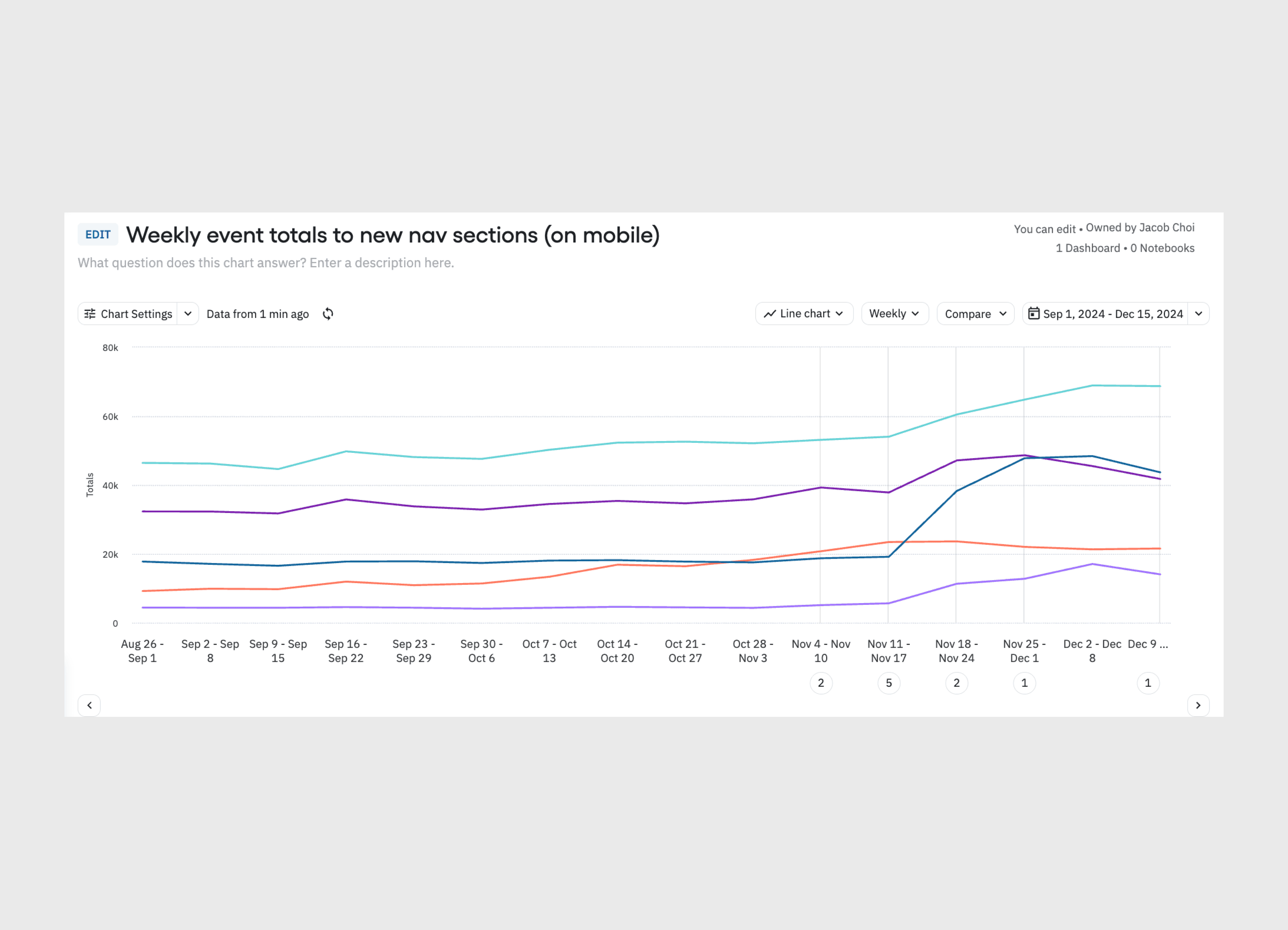 Amplitude chart above illustrates the inflection point where weekly visitors went from 20k per section to 40k+ after redesign