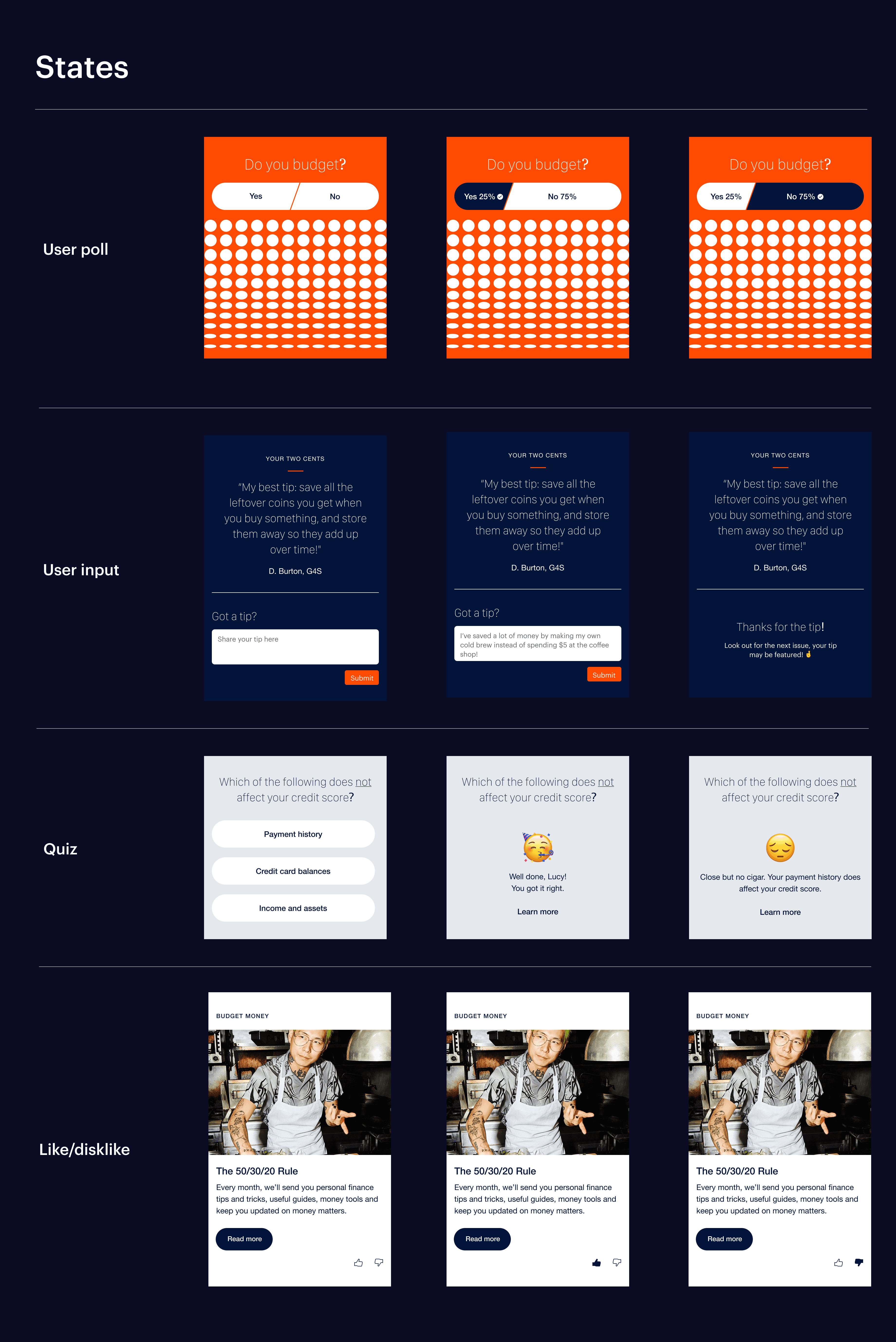 We began by conducting user research and testing to validate interest in financial content. Through surveys and interviews with employees and HR teams, we identified key insights: